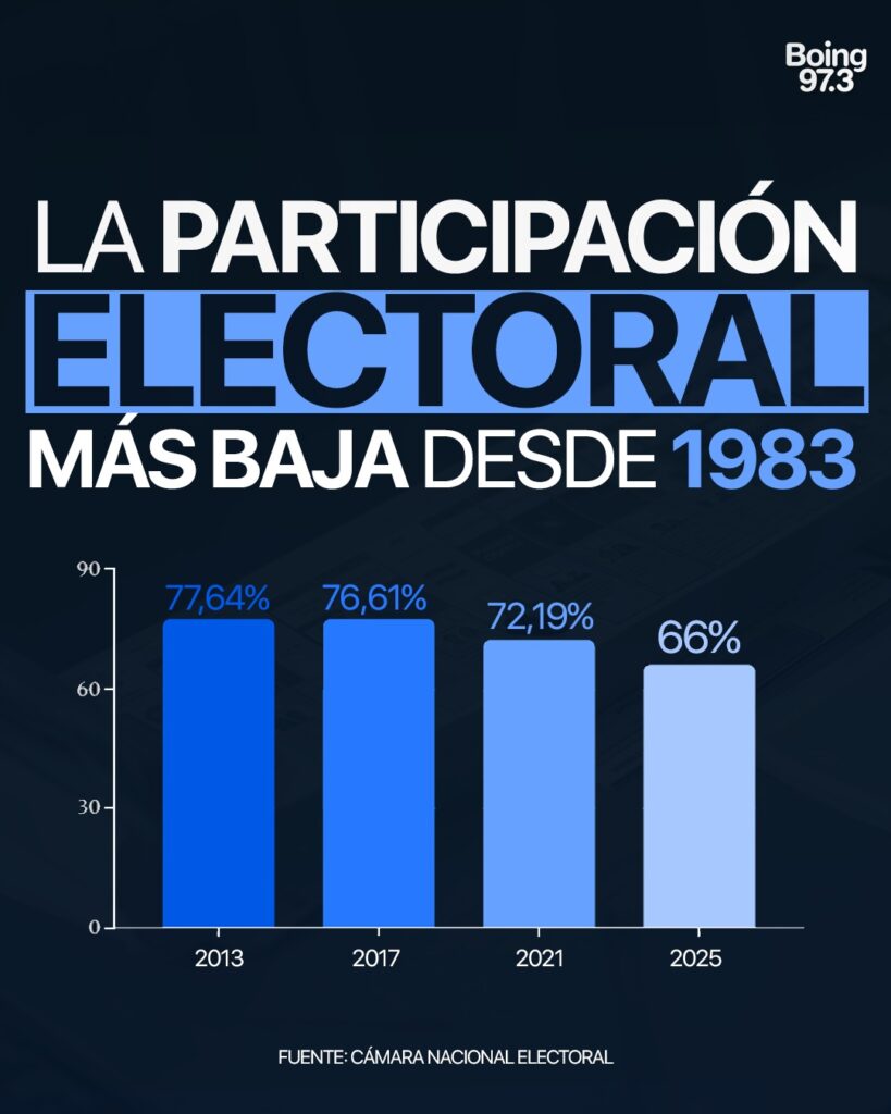 La participación electoral en las elecciones legislativas de este domingo fue del 66 por ciento, según informaron fuentes oficiales. Esta cifra marca un récord histórico negativo, convirtiéndose en la más baja desde el retorno de la democracia en 1983.