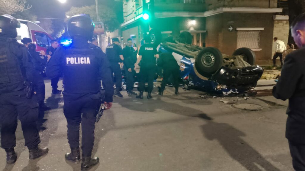 Según lo que se puede observar en una cámara de seguridad, la camioneta cruza mientras el semáforo cambiaba a rojo y el móvil policial, con sirenas y las balizas prendidas la embistió en uno de los costados.