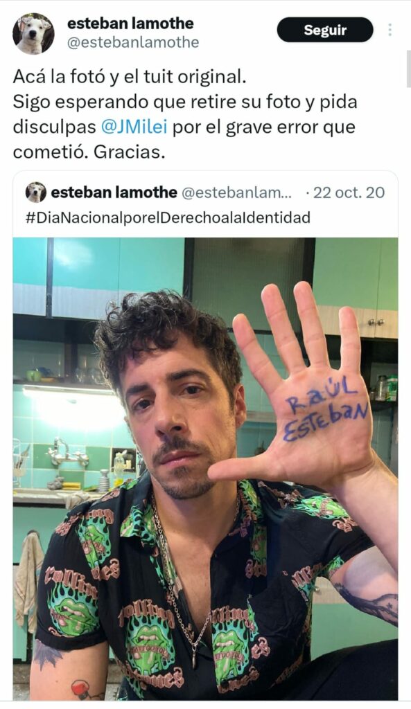 Para concluir, Lamothe escribió: “Sigo esperando que retire su foto y pida disculpas @JMilei por el grave error que cometió. Gracias”.