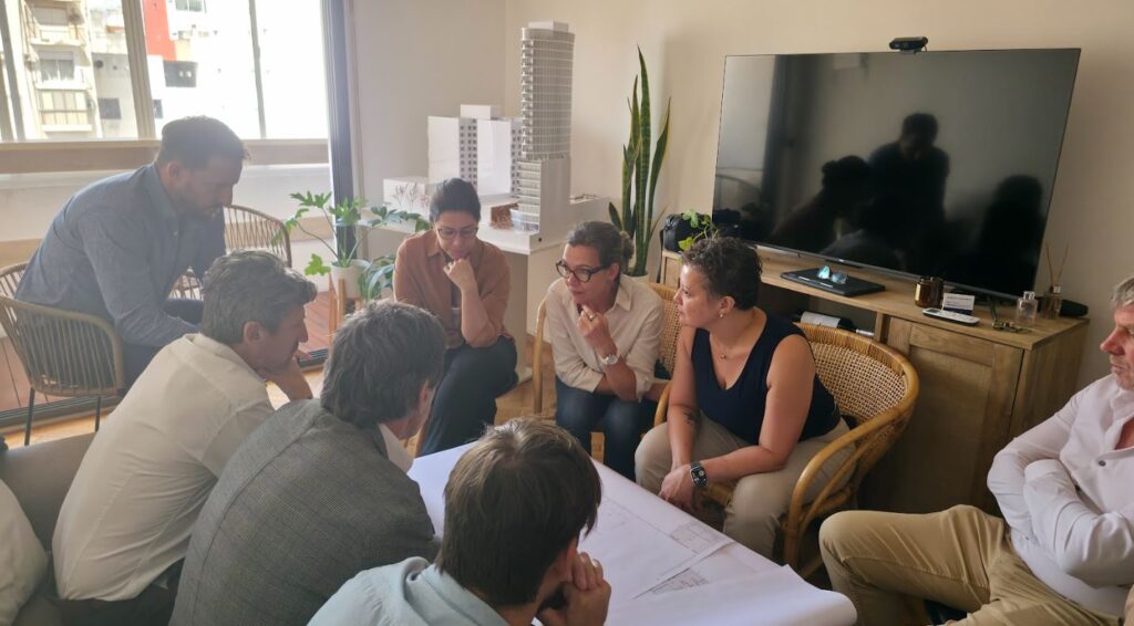 El equipo de auditoría integrado por Daniela Quintas (Directora de Arquitectura), Angélica Tineo (Directora de Arquitectura y Construcción) y Ana Sampaio (Directora de Ingeniería), recorrió las oficinas de Argenway — la desarrolladora del emprendimiento— y la obra en construcción.