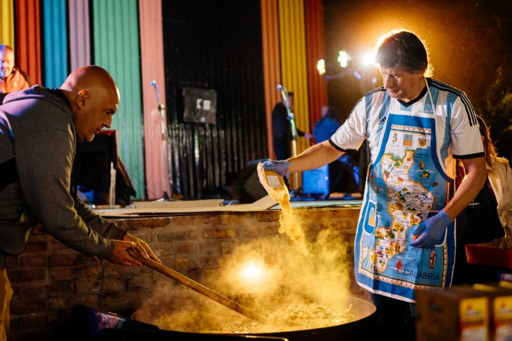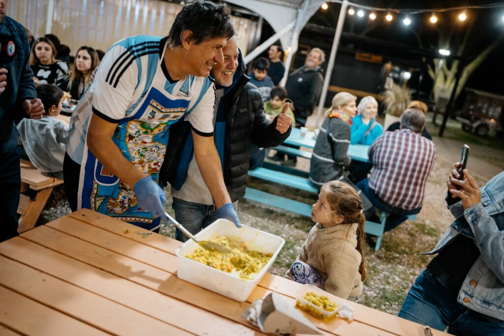 Uno de los momentos más significativos fue la colaboración del intendente Santacroce y el secretario de Obras Públicas, Maximiliano García, quienes se pusieron manos a la obra para cocinar un arroz con pollo al disco, gracias a la generosa colaboración de Pollo27. Este gesto permitió que los cientos de participantes compartieran una comida comunitaria, reforzando el sentimiento de unión y gratitud.