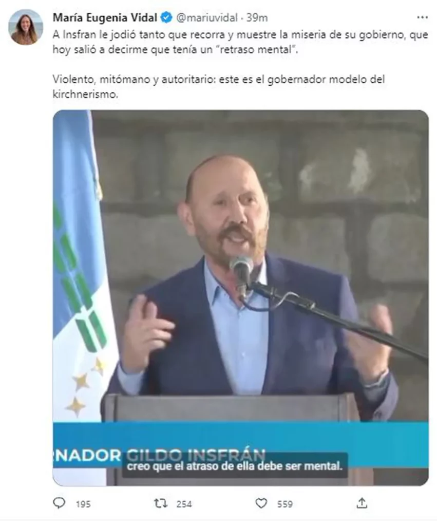 “Violento, mitómano y autoritario: este es el gobernador modelo del kirchnerismo”, afirmó en un mensaje publicado a través de su cuenta de Twitter. El lunes, Vidal realizó una conferencia de prensa luego de recorridos por Formosa, donde dijo que los vecinos quieren un cambio tras un ciclo de 27 años que está agotado.