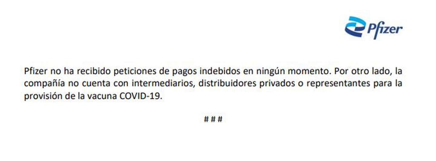 Después de las declaraciones de la ex ministra de Seguridad, la farmacéutica también se involucró en la polémica y argumentó que no hubo “pagos indebidos en ningún momento”. “La compañía no cuenta con intermediarios, distribuidores privados o representantes para la provisión de la vacuna”, se lee en el documento.