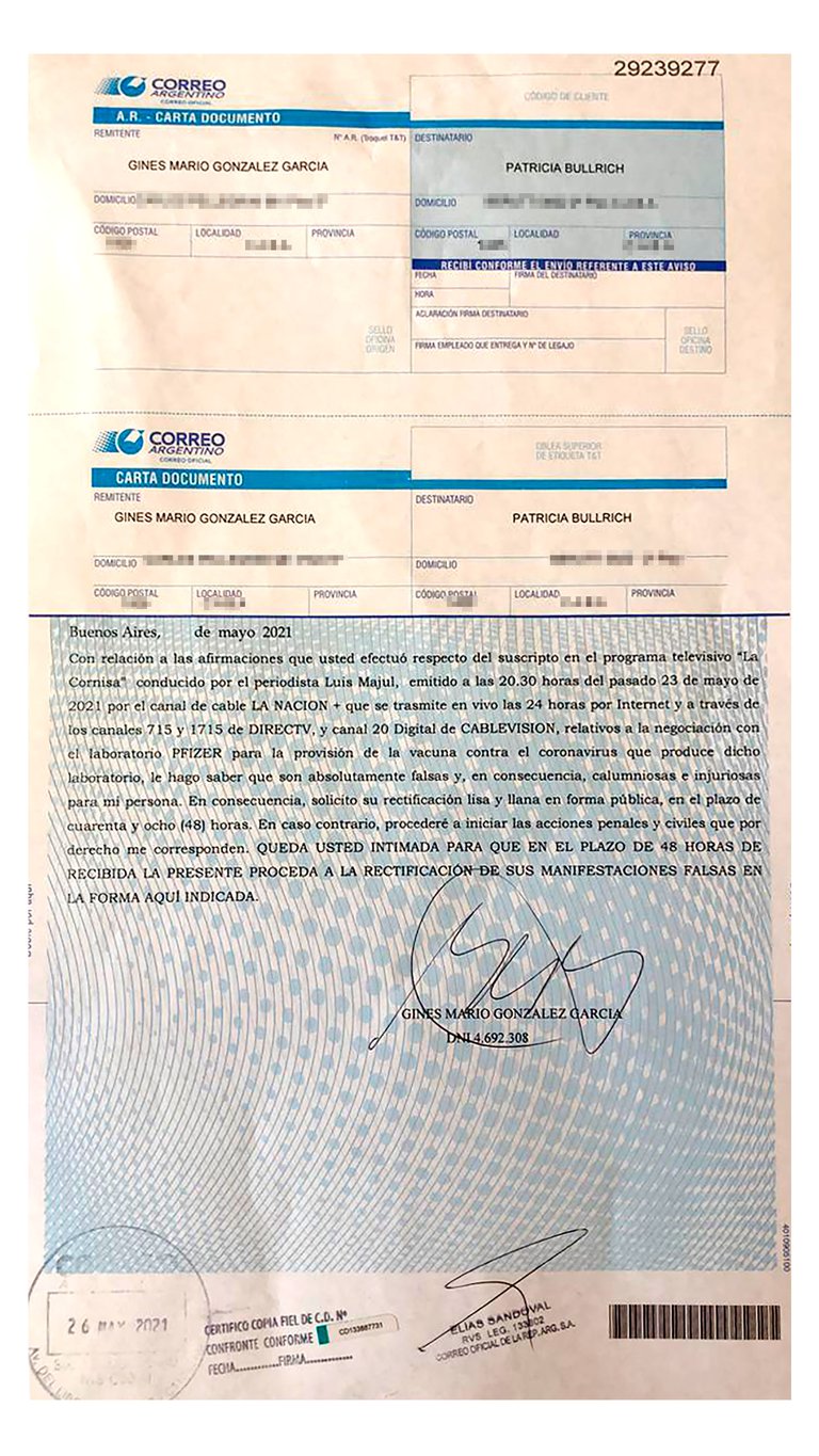 “Con relación a las afirmaciones que usted efectuó respecto del suscripto en el programa televisivo La Cornisa, conducido por el periodista Luis Majul, emitido a las 20.30 del pasado 23 de mayo de 2021 por el canal de cable La Nación+, relativos a la negociación con el laboratorio Pfizer para la provisión de la vacuna contra el coronavirus que produce dicho laboratorio, le hago saber que son absolutamente falsas y, en consecuencia, calumniosas e injuriosas para mi persona”, indicó el ex funcionario.