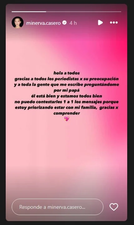 Casero fue internado de urgencia y aún continúa hospitalizado y generó gran espectativa. Por tanto, Minerva Casero, a través de sus historias de instagram: “Gracias a todos los periodistas por su preocupación y a toda la gente que me escribe preguntándome por mi papa”.