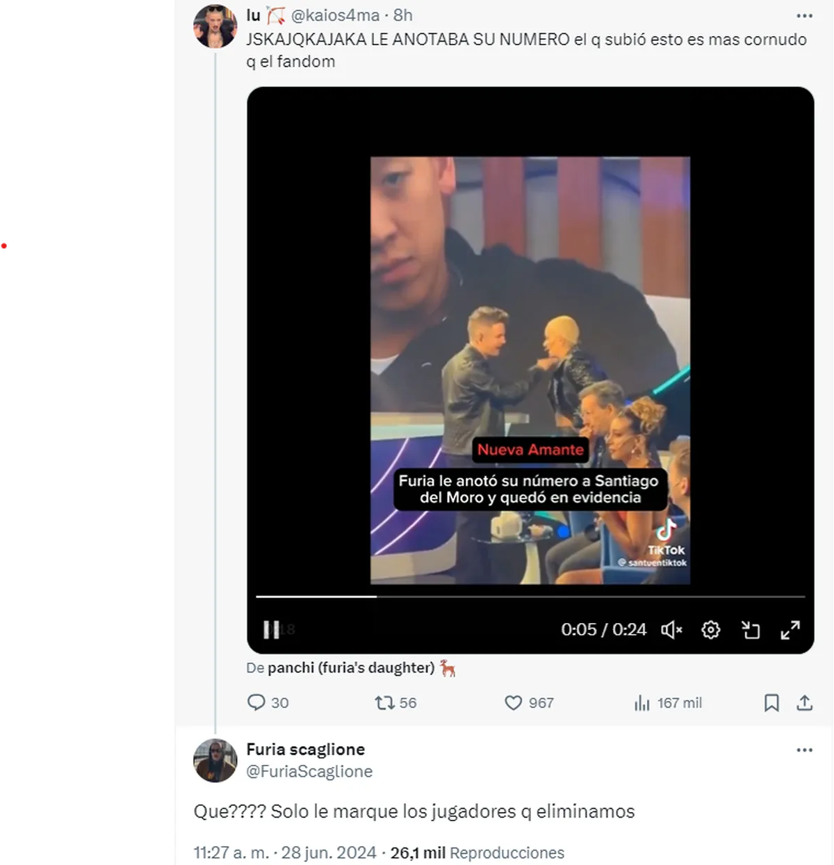 Este viernes, Furia se encargó de desmentir el supuesto amorío con Santiago del Moro. La ex GH citó un tuit que contenía el video en cuestión y un comentario picante de una fan que dijo: “Le anotaba su número…”, a lo que expresó su asombro: “¿Qué?”.