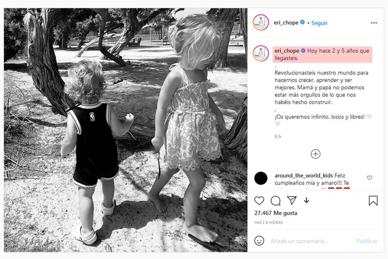“Hoy hace 2 y 5 años llegaron. Revolucionaron nuestro mundo para hacernos crecer, aprender y ser mejores. Mamá y papá no podemos estar más orgullosos de lo que nos han hecho construir”, escribió la española en su cuenta de Instagram junto a una foto de ellos.