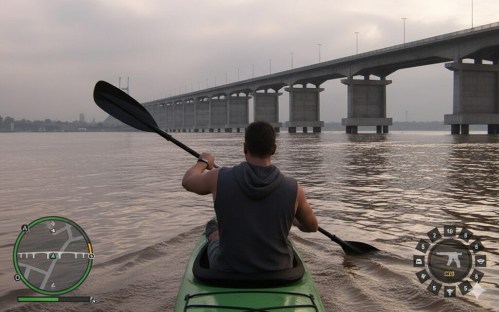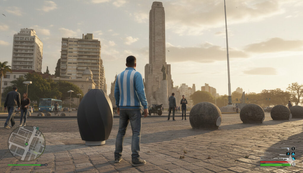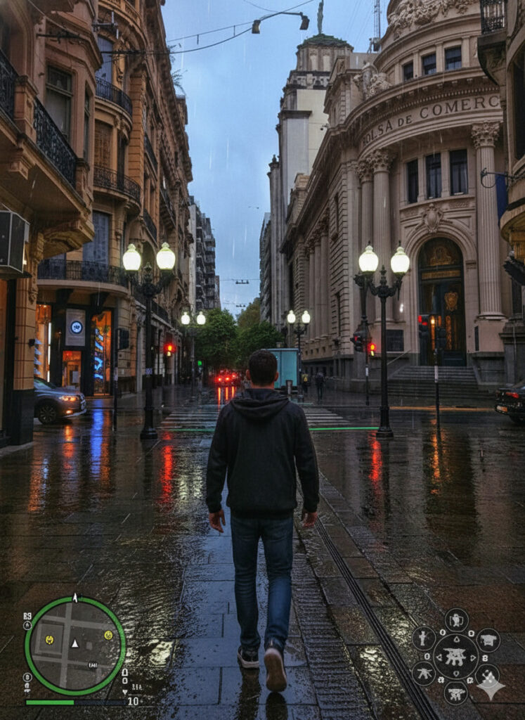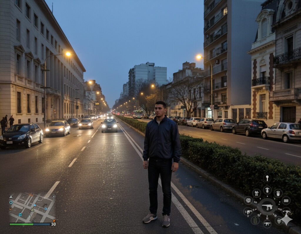 La recreación no se limitó a cambiar los colores: incluyó la clásica interfaz con el mapa en la esquina inferior, el contador de “estrellas” de búsqueda policial y la iluminación saturada típica de los títulos de acción. Los usuarios pudieron reconocer rápidamente esquinas de la zona centro, los silos y las bajadas hacia la costanera, todo con una fidelidad que respeta los recorridos y la fisonomía que caminamos todos los días.