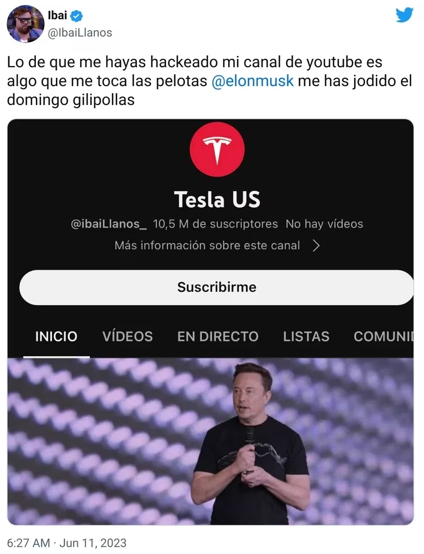 En su cuenta de Twitter, Ibai se quejó en tono gracioso de lo que había ocurrido con su canal de videos: “Lo de que me hayas hackeado mi canal de youtube es algo que me toca las pelotas @elonmusk. me has jodido el domingo gilipollas”, escribió el streamer.
