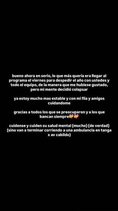 “Lo que más quería era llegar al programa el viernes para despedir el año con ustedes y con todo el equipo, de la manera que me hubiese gustado. Pero mi mente decidió colapsar. Ya estoy mucho más estable y con mi familia y amigos cuidándome. Gracias a todos los que se preocuparon y a los que bancan siempre. Cuídense y cuiden su salud mental, mucho, de verdad”, cerró Marti Benza, que afortunadamente ya se está recuperando.