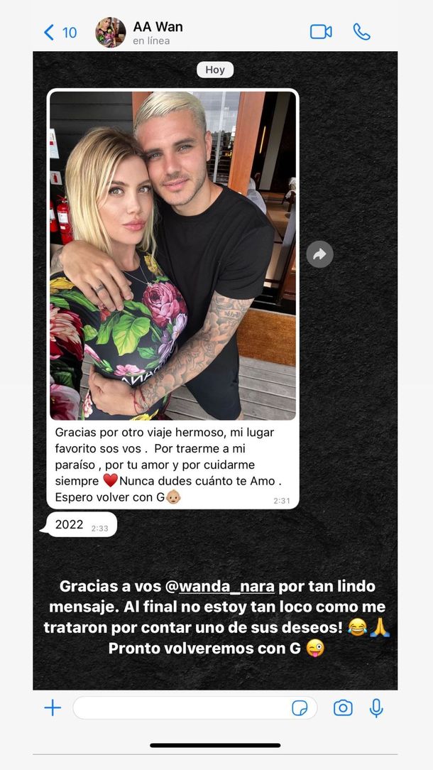 En este marco, en las últimas horas, en su cuenta de Instagram el futbolista colgó una captura de un chat con la botinera, donde lee una frase con la que dan a entender que estarían con las ganas de tener un bebé.