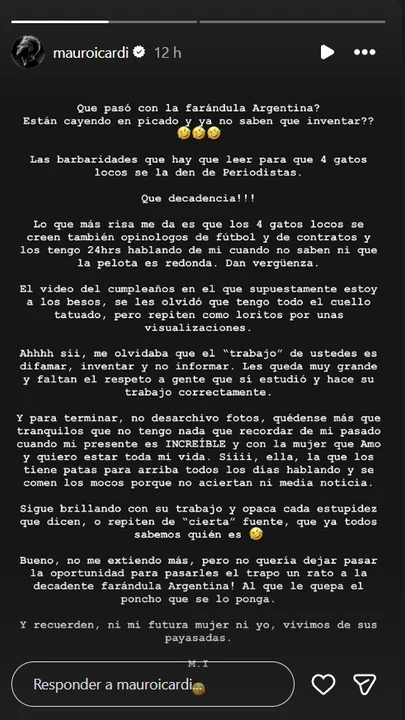 Finalmente, Icardi volvió a apuntar contra Wanda Nara, a quien acusó de ser la fuente de las versiones falsas que circulan en los programas de espectáculos. “(La China) sigue brillando con su trabajo y opaca cada estupidez que dicen, o repiten de cierta fuente que ya todos sabemos quién es”, concluyó.