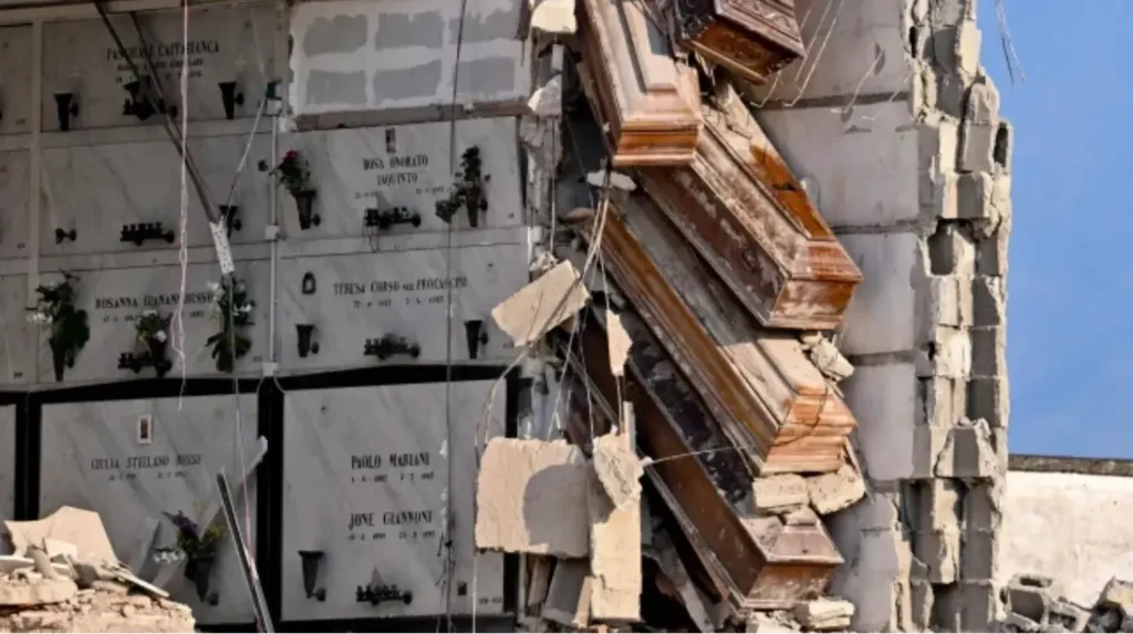 Más de una decena de ataúdes quedaron colgando luego de que el nicho donde se encontraban colapse y se derrumbe. El hecho ocurrió este lunes en el Cementerio Poggioreale Monumental, el más grande de Nápoles, en Italia.