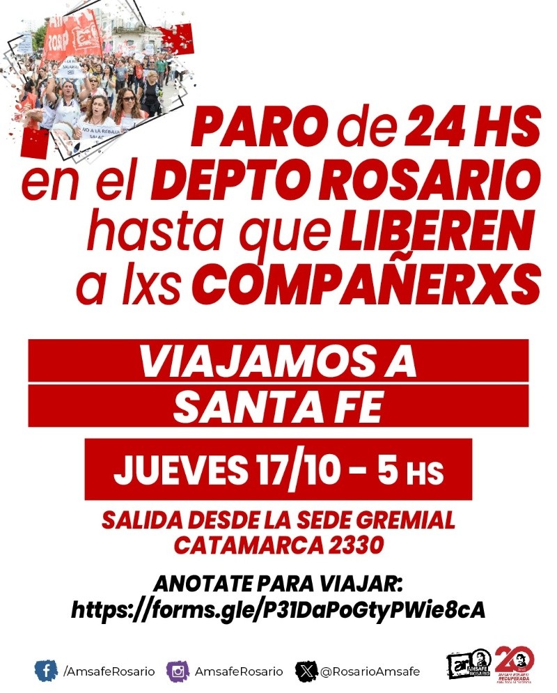 En Rosario, entre tanto, el gremio docente respondió a las detenciones -que se produjeron ayer por la mañana tras allanamientos en las casas de los delegados- con una movilización durante la tarde del miércoles y el repentino llamado a un paro este jueves.