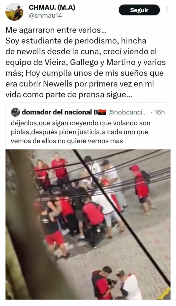 “Me agarraron entre varios… Soy estudiante de periodismo, hincha de Newell’s desde la cuna, crecí viendo el equipo de Vieira, Gallego y Martino y varios más; Hoy cumplía unos de mis sueños que era cubrir Newell’s por primera vez en mi vida como parte de prensa” comenzó relatando la víctima. Luego, añadió: “Entre varios me sacaron del sector de prensa para pegarme, insultarme y robarme mis elementos de trabajo, saben pq fue todo? Por no tener una camiseta de Newell’s mientras hacía mi trabajo… En ningún momento hice algún gesto ni alusión a nada, solo hacía mi trabajo periodístico”.