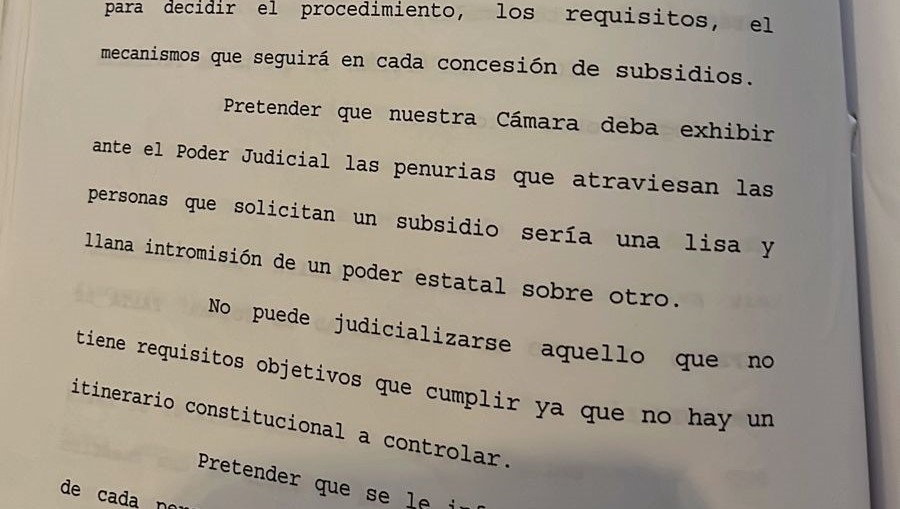 “Pretender que nuestra Cámara deba exhibir ante el Poder Judicial las penurias que atraviesan las personas que solicitan un subsidio, sería una lisa y llana intromisión de un poder estatal sobre otro. No puede judicializarse aquello que no tiene requisitos objetivos que cumplir, ya que no hay un itinerario constitucional a controlar”, contestó esa vez mediante un escrito la Cámara Alta provincial ante la solicitud judicial.