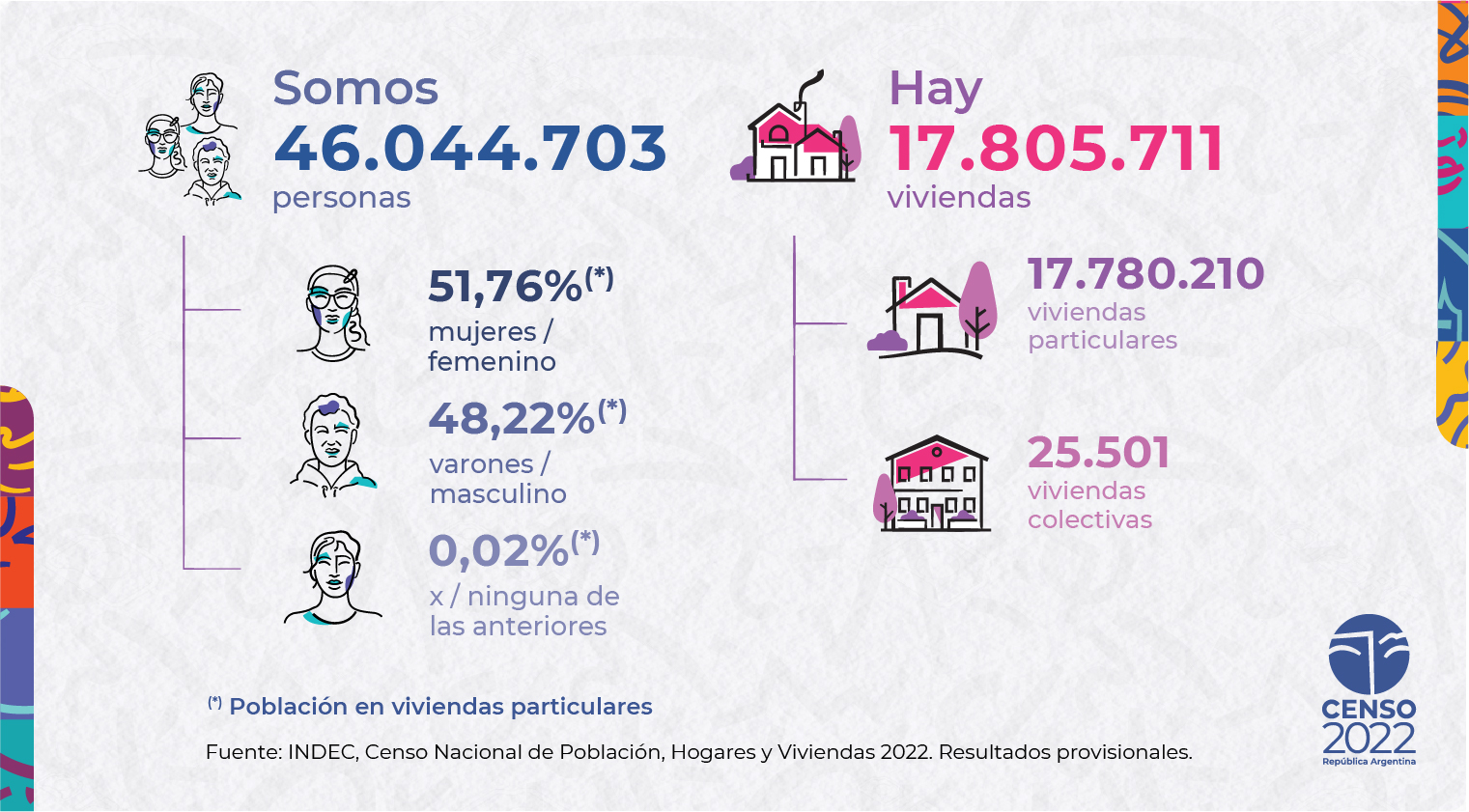 Estos datos se desprenden del primer informe detallado presentado hoy por el Instituto Nacional de Estadística y Censos (INDEC) sobre el Censo 2022, realizado hace un año, que revela que Argentina cuenta con una población de 46,044,703 personas, un aumento del 14.8% desde 2010.