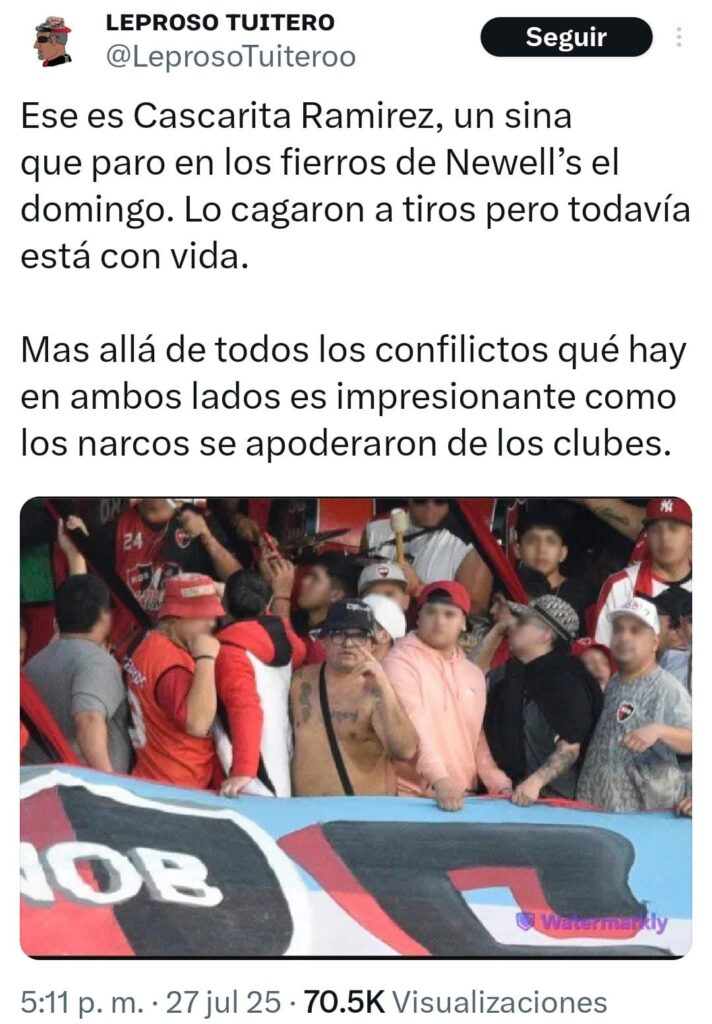 Ramírez fue baleado el miércoles 22 de julio a pocos metros del Hospital de Niños, en Rueda al 1800, el mismo lugar en el que había purgado la prisión domiciliaria por su condena en la justicia federal y en el que había sido allanado por venta de drogas en 2020. El violento hecho que lo tuvo como víctima se dio apenas tres días después de una balacera mortal contra Brian Figueroa, simpatizante leproso que volvía del Coloso del Parque de ver a Newell’s y resultó emboscado, a pocos metros del atentado contra “Cascarita”.