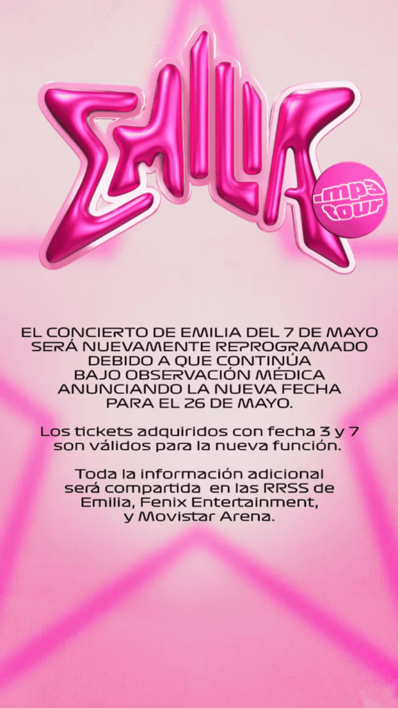 Desde la productora del show, anunciaron a través de las redes cuándo se realizará el show: “El concierto de Emilia del 7 de mayo será nuevamente reprogramado debido a que continúa bajo observación médica anunciando la nueva fecha para el 26 de mayo. Los tickets adquiridos con fecha 3 y 7 son válidos para la nueva función”.
