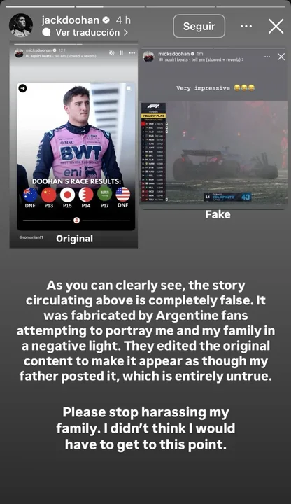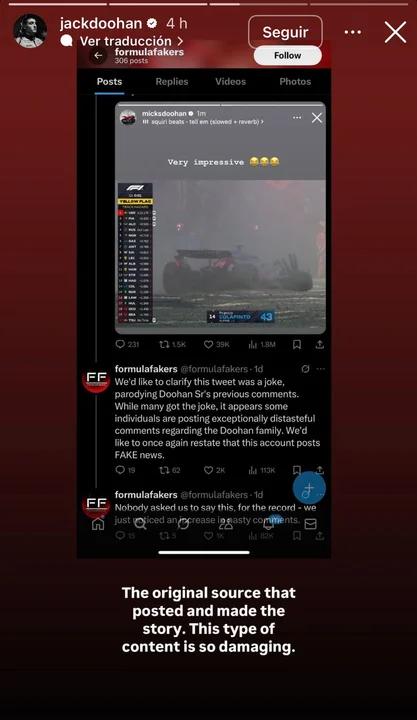 Doohan compartió capturas de pantalla como prueba de su denuncia, donde en ellas se ve un posteo atribuido falsamente a su padre, Mick Doohan, en el que supuestamente se burlaba del accidente de Colapinto durante la clasificación del Gran Premio de Emilia Romaña.