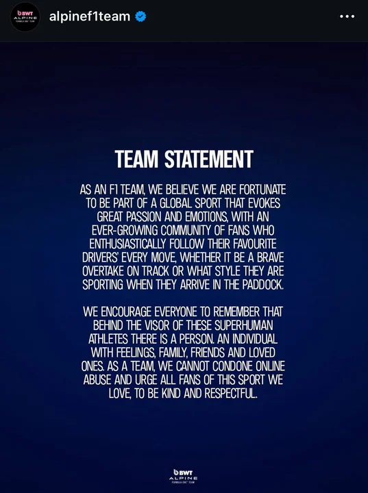 Animamos a todos a recordar que detrás de la visera de estos atletas sobrehumanos hay una persona. Un individuo con sentimientos, familia, amigos y seres queridos. Como equipo, no podemos tolerar el abuso en línea e invitamos a todos los aficionados de este deporte que amamos a ser amables y respetuosos“.