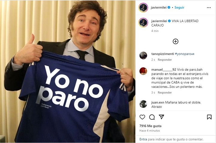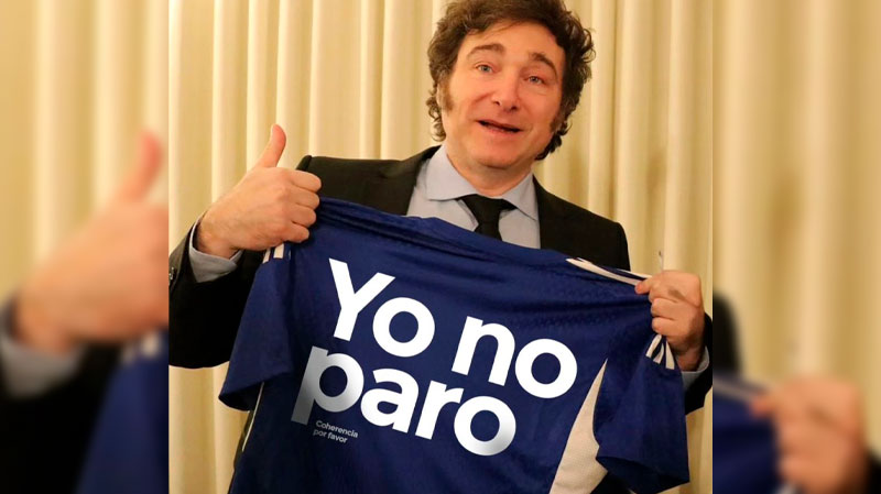 El presidente Javier Milei utilizó sus redes sociales para desafiar la medida de fuerza general tomada por la CGT este jueves, con una remera escrita: “Yo no paro”. La huelga comenzó a la medianoche y, en medio de cruces verbales entre funcionarios del Gobierno y referentes sindicales, Milei aprovechó para subir a sus redes sociales una foto con la remera en cuestión.