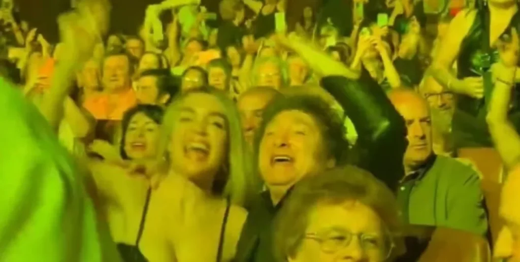 Cuando el imitador cantó Dame el fuego de tu amor, todo el teatro se levantó de su asiento para disfrutar de uno de los temas musicales más conocidos del cantante. Una de las personas que estaba en el público filmó a Milei y Fátima agitando sus brazos al ritmo de la canción.