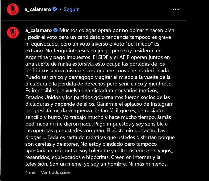 El cantante es uno de los muchos que hicieron público su apoyo al actual presidente con posteos en redes sociales. Si bien mostrar su postura política lo hizo perder seguidores, Calamaro cuestionó al apoyo “progre” que algunos de sus colegas obtienen: “Ganarme el aplauso de Instagram progresista me da vergüenza de tan fácil que es. Creen en internet y la televisión. Son un meme, yo soy un hombre”, escribió en su Instagram.