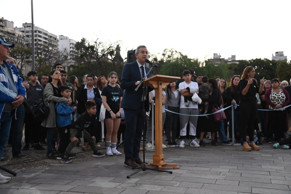 Finalmente, Javkin proclamó: “Bajo este manto que nos une, volvemos a clamar con fervor por el sueño de una nación libre y de una soberanía indeclinable, por aquello que con justicia nos corresponde, la perdida perla austral. Las Malvinas fueron, son y serán por siempre argentinas. Honor y gloria a nuestros héroes”.