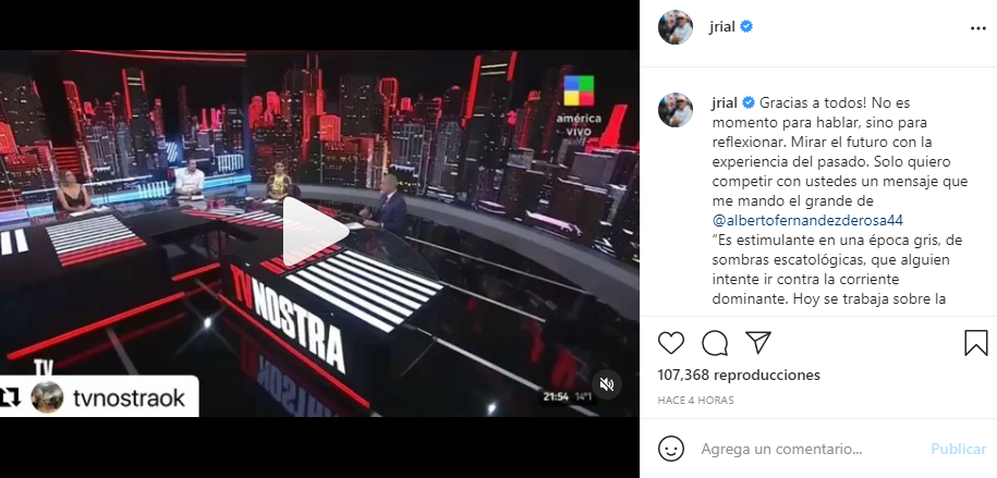 Luego de renunciar -en vivo- a TV Nostra, Jorge Rial utilizó sus redes sociales para compartir un mensaje que le envió Alberto Fernández de Rosa. “Gracias a todos”, redactó en una publicación donde adjuntó el video de su anuncio.