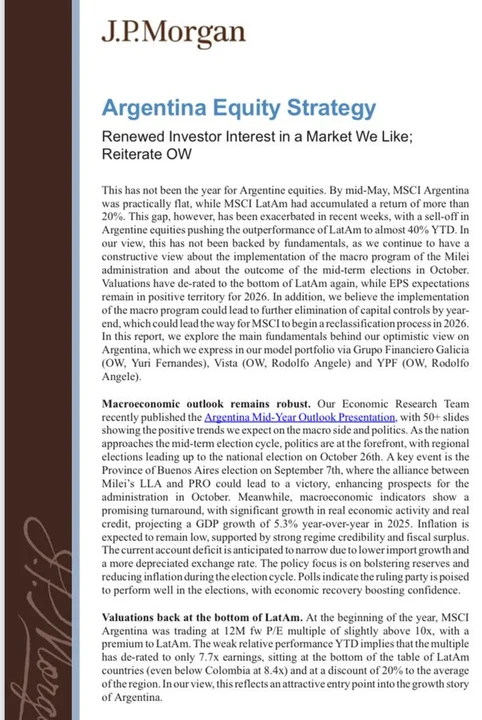 El banco estadounidense JP Morgan mantuvo su postura optimista frente al plan económico del gobierno de Javier Milei y recomendó invertir en acciones argentinas.