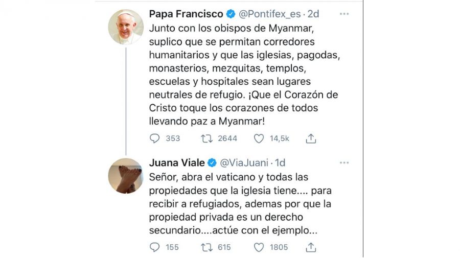 “Junto con los obispos de Myanmar, suplico que se permitan corredores humanitarios y que las iglesias, pagodas, monasterios, mezquitas, templos, escuelas y hospitales sean lugares neutrales de refugio. ¡Que el Corazón de Cristo toque los corazones de todos llevando paz a Myanmar!”, manifestó el Jefe de Estado de la Ciudad del Vaticano en el tuit que desató el descargo de Juana Viale.