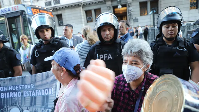 Frente al Congreso un grupo de jubilados espera cada semáforo en rojo para bajar a la calle de Rivadavia y Callao y mostrar carteles con sus reclamos por mejoras en los haberes y el regreso de los medicamentos gratis, entre otros. Un cartel dice “Ayúdame a luchar. El próximo viejo sos vos”.