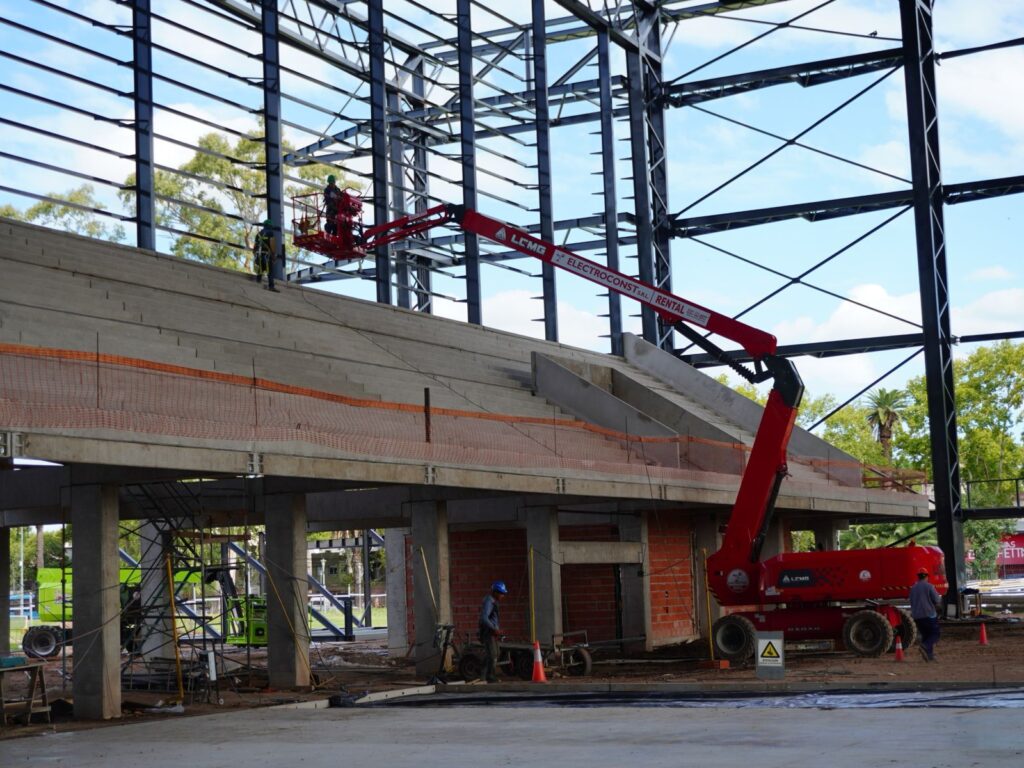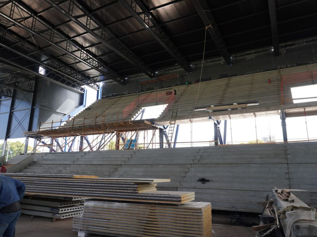 Sobre el sector de tribunas, se trabaja en la ejecución de completamiento de estructura de hormigón, sobre el premoldeado finalizado. Además, se ejecuta el piso llaneado de hormigón en la nave principal.