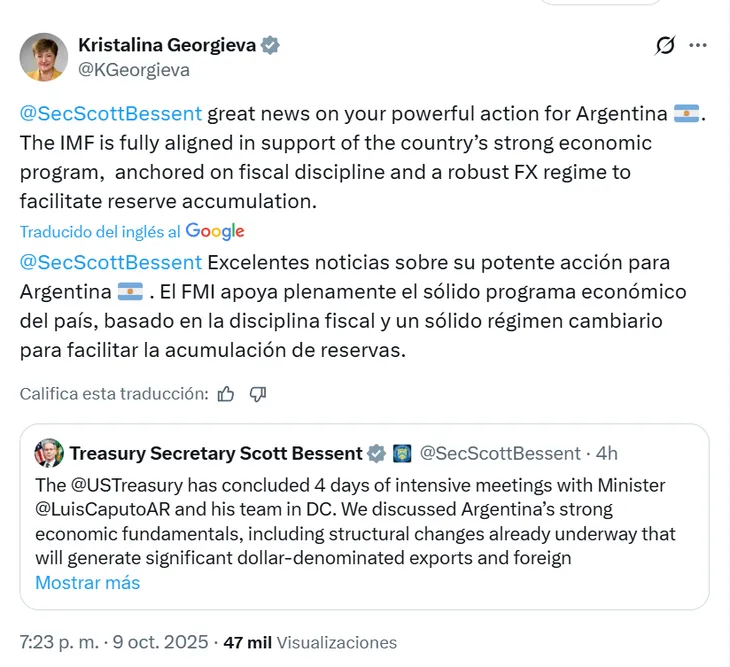 Georgieva compartió el posteo en X de Bessent donde anuncia los detalles del salvataje y afirmó que son “Excelentes noticias sobre su potente acción para Argentina”. Días atrás había anunciado que se había reunido con el funcionario estadounidense para discutir sobre las posibles acciones sobre situación argentina.