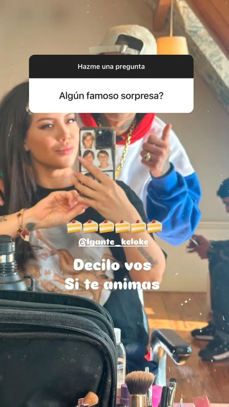 La famosa imagen de la polémica muestra a la hermana de Zaira Nara muy pegada a L-Gante, a quien le puso una caja justo delante de la cara del artista. Y apenas más abajo, tiró la respuesta. “Decilo vos si te animás”, despachó la hija de Andrés Nara, quien arrobó a Elián Valenzuela.