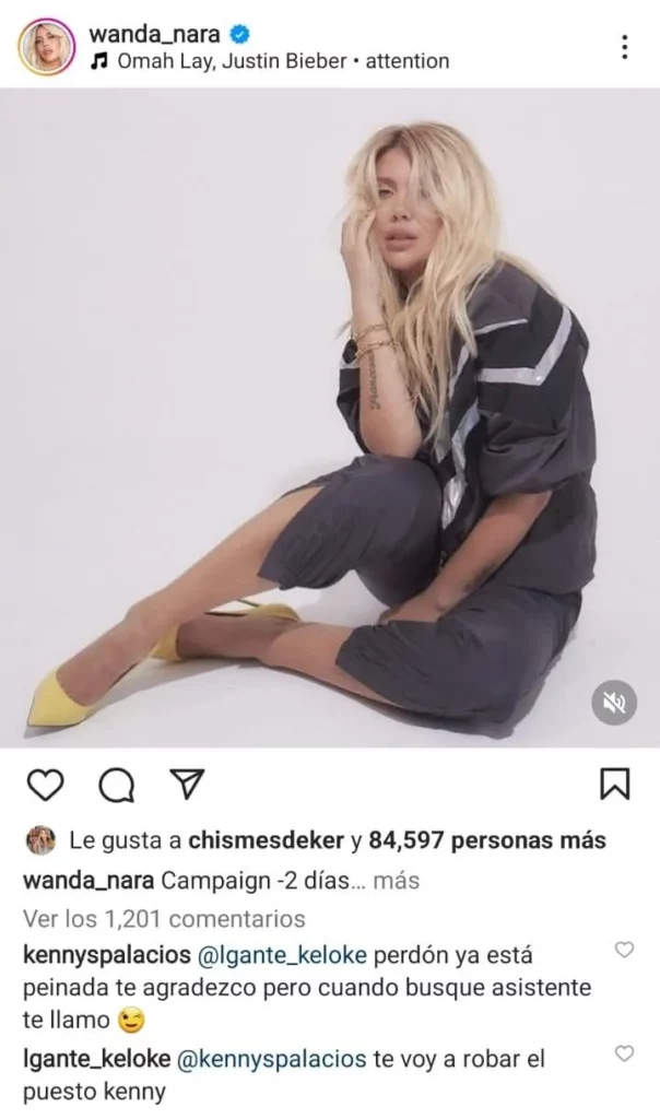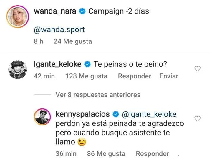 Wanda optó por no contestar al comentario. No obstante, Kenny Palacios, su maquillador y amigo, se encargó de la respuesta. “Perdón. Ya está peinada. Te agradezco pero cuando busque asistente te llamo”, escribió el estilista. Si bien finalmente borró el comentario, se animó a replicar a Palacios. “Te voy a robar el puesto”, escribió el cantante en la publicación que realizó Wanda Nara en su cuenta de Instagram.