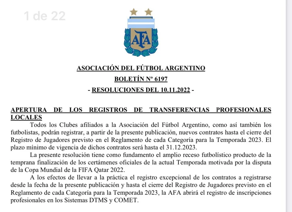 En el boletín 6197 con resoluciones tomadas al 10 de noviembre de 2022, la casa madre del fútbol argentino comunica: “Todos los clubes afiliados a la Asociación del Fútbol Argentino, como así también los futbolistas, podrán registrar, a partir de la presente publicación, nuevos contratos hasta el cierre del Registro de Jugadores previsto en el Reglamento de cada categoría para la Temporada 2023″.