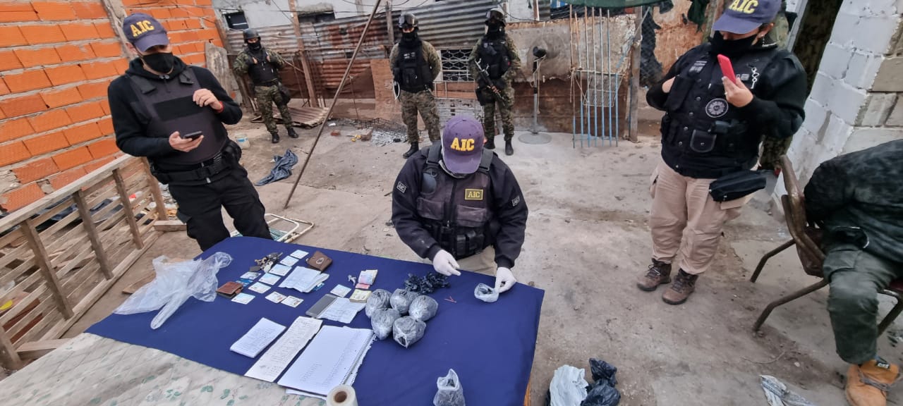 La AIC detuvo a siete personas, seis hombres y una mujer, de entre 25 y 40 años de edad, e incautaron gran cantidad de material estupefaciente, casi 700 dosis de cocaína, precintos y elementos para fraccionar la droga, y un trozo compacto de cocaína. También secuestraron armas cortas y largas: un revólver calibre 32 con siete alveolos conteniendo una munición del mismo calibre en cada uno, una escopeta recortada calibre 12 y cartuchos, y un total de $70.000 mil pesos en efectivo, entre dólares y pesos argentinos.