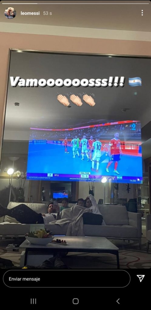En la publicación se lo puede ver a él acompañado de Antonella Rocuzzo, su mujer, y dos de sus hijos, Thiago y Mateo. Los cuatro se encontraban recostados en un sillón en la casa de Lionel, mirando atentamente lo que transmitía el canal estatal encargado de televisar las acciones de la cita mundialista de futsal. La foto fue acompañada de una leyenda: “Vamoooooosss” y diversos emojis de aplausos.