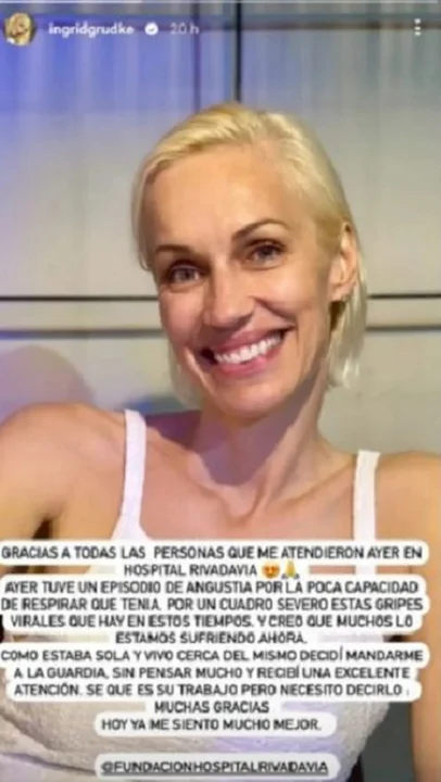 “Gracias a todas las personas que me atendieron ayer en el Hospital Rivadavia. Tuve un episodio de angustia por la poca capacidad de respirar que tenía por un cuadro severo de estas gripes virales que hay en estos tiempos, y creo que muchos lo estamos sufriendo ahora”, escribió Ingrd Grudke en sus redes sociales.
