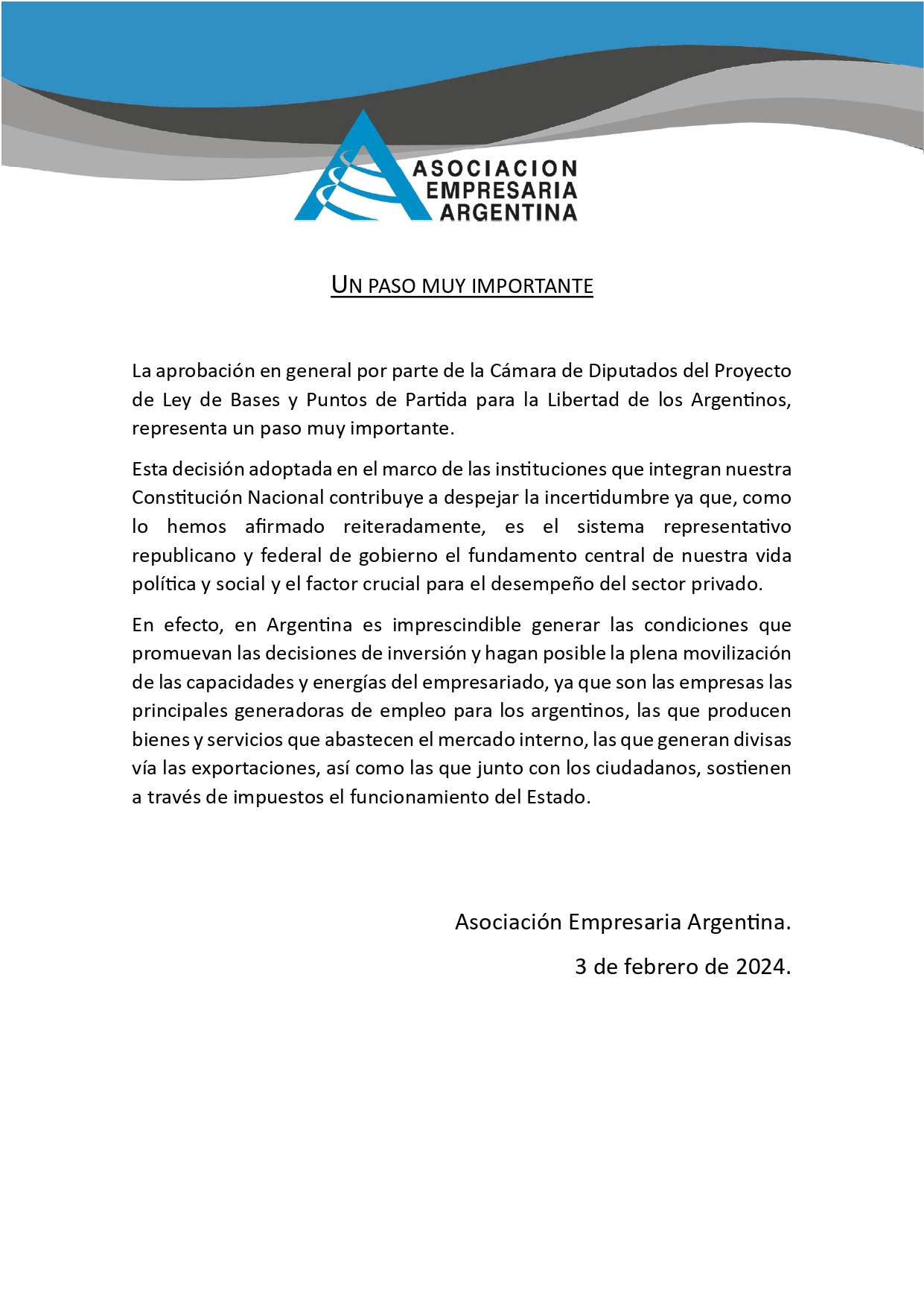 Tras la media sanción de la Cámara de Diputados de la ley Bases, la Asociación Empresaria Argentina (AEA) celebró la media sanción y expresó que “representa un paso muy importante”.