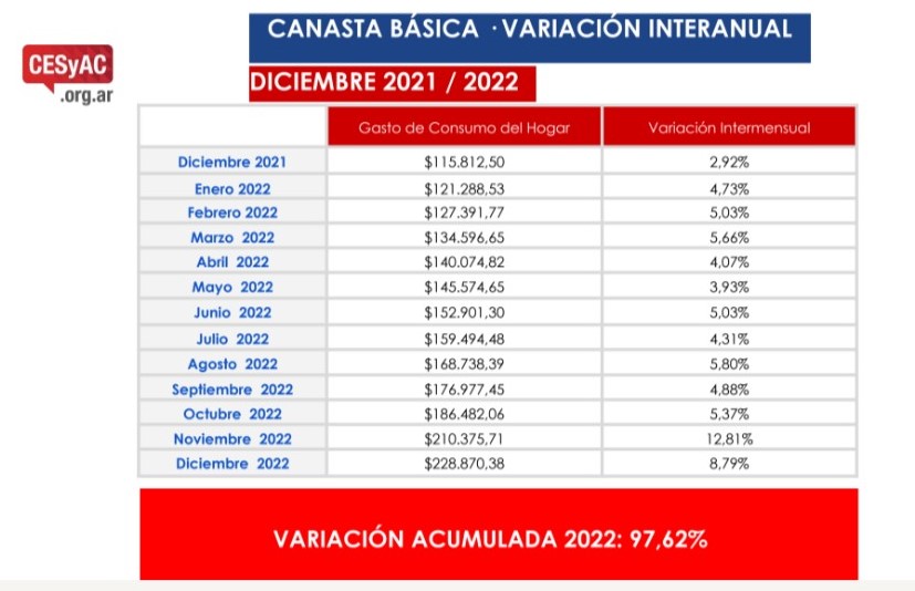 En la previa de conocerse los detalles de la Canasta Básica del mes de diciembre, el Centro de Educación, Servicios y Asesoramiento al Consumidor (Cesyac) difundió los datos de la misma en 2022. Así, se reveló que aumentó un 97,62% en el transcurso del año.