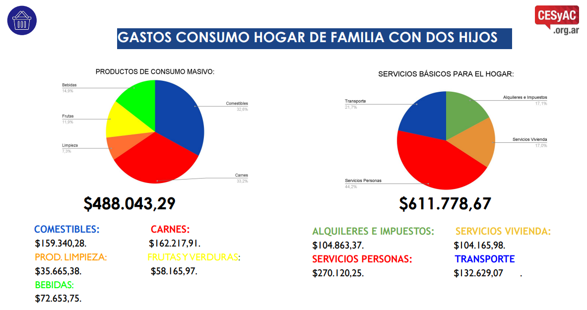 Los datos aportados por el CESyAC indicaron que durante el mes de mayo una familia tipo integrada por dos personas necesitó de más de 488 mil pesos para cubrir los productos de consumos masivos en los que se incluyen alimentos y limpieza. Por su parte, el informe indicó que se necesitaron más de 611 mil pesos para cubrir los costos de los servicios básicas entre los que se incluyen alquiler, impuestos y servicios públicos.