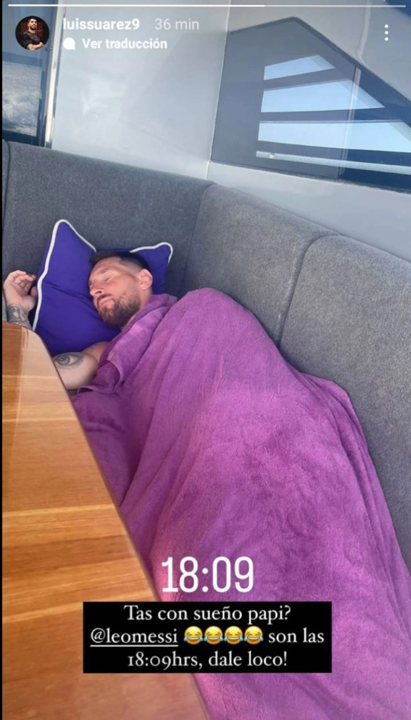 El delantero uruguayo y compañero del argentino en Barcelona le sacó una foto durmiendo la siesta al atacante del PSG y lo viralizó a través de su perfil en redes sociales. “¿Tas con sueño, papi?”, escribió Suárez en una imagen donde se lo ve a Messi tapado y durmiendo la siesta en lo que parece ser el interior de un barco.