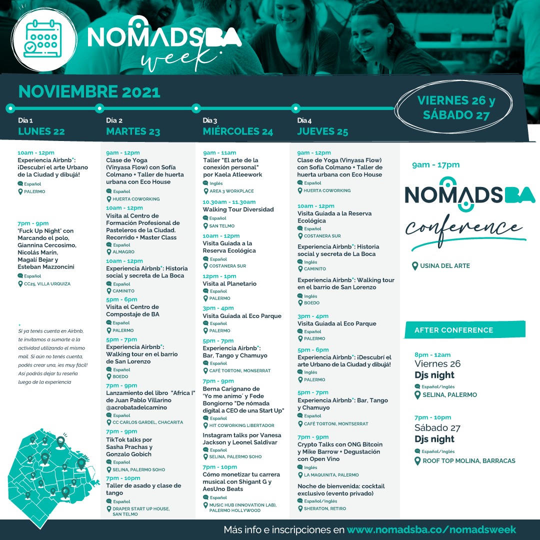 Además del evento de dos días de NomadsBA, previo a la conferencia, del 22 al 25 de noviembre, la Ciudad organizará más de 25 actividades gratuitas pensadas para nómades, como charlas, visitas guiadas, apertura de espacios de coworking y charlas sobre las facilidades y oportunidades que ofrece Buenos Aires.