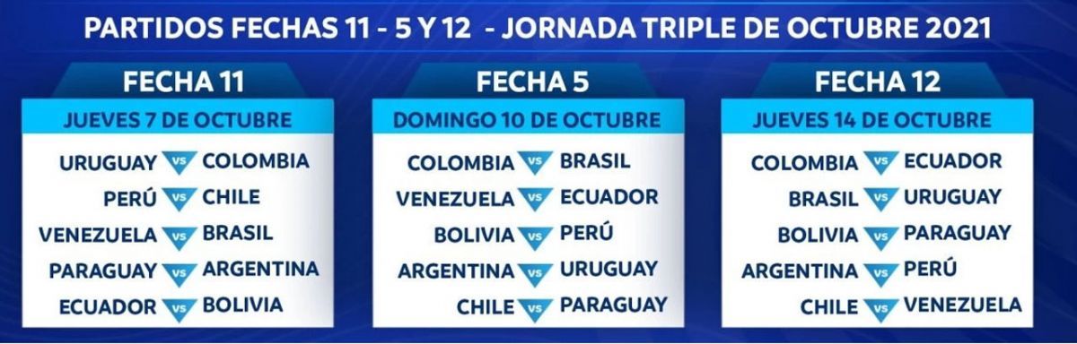 La CONMEBOL anunció que en el mes de octubre habrá tres fechas diferentes respecto a las Eliminatorias Sudamericanas, rumbo al Mundial de Qatar 2022. Además, se ha querido estipular que las ventanas internacionales de FIFA, de los meses de septiembre y octubre, constarán de 3 fechas cada una para las Eliminatorias Sudamericanas: 11, 5 y 12.