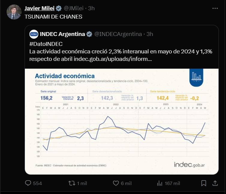En mayo, la economía registró la primera suba interanual en 7 meses. Así, el Estimador mensual de actividad económica (EMAE) avanzó 2,3% en la comparación con 2023 pero también subió de 1,3% respecto a abril, primer dato positivo desde agosto del año pasado, según informó este jueves el Instituto Nacional de Estadística y Censos (INDEC).