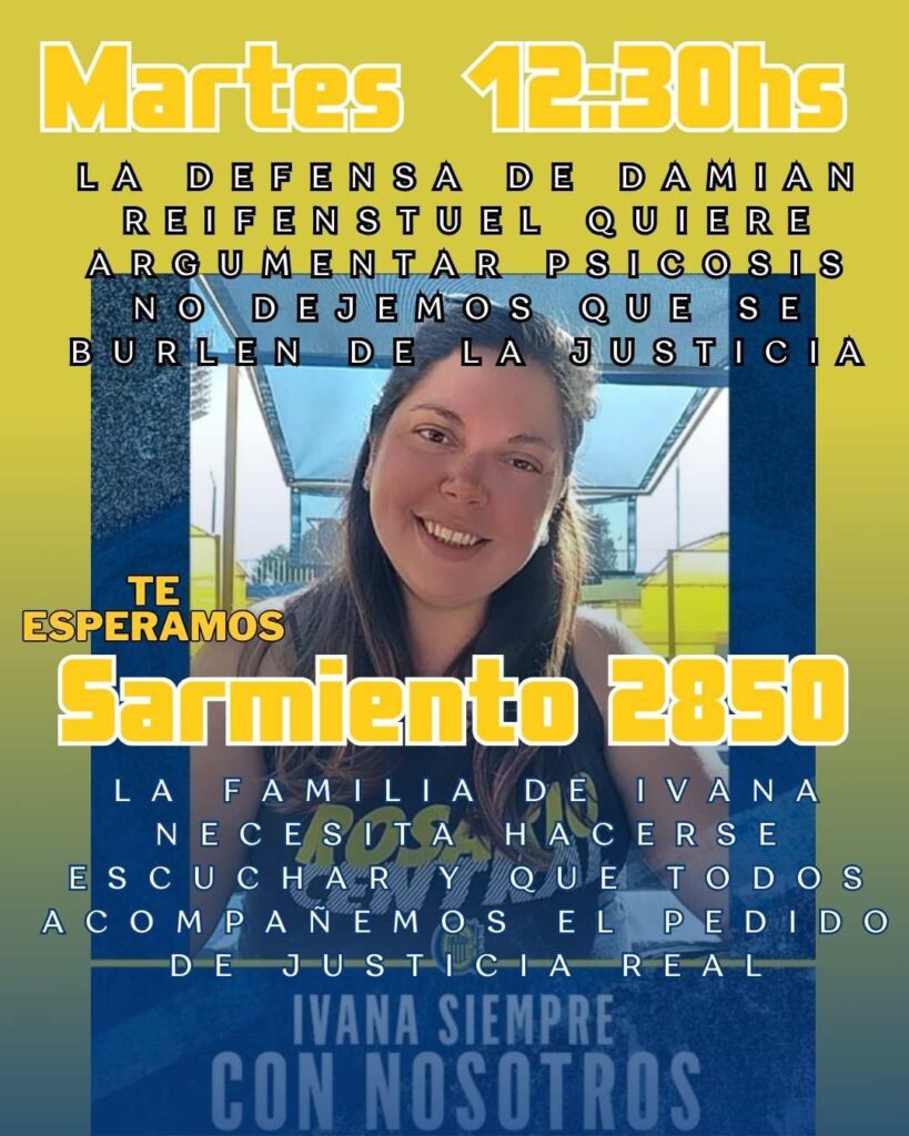 La familia de Ivana Garcilazo convocó a una concentración este martes a las 12.30 en Sarmiento 2850, frente a la sede judicial donde la defensa de Damián Reifenstuel —acusado por el crimen de la joven rosarina— presentará un nuevo intento para modificar el rumbo de la causa.