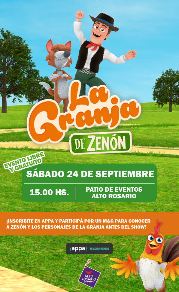 Este sábado 24 de septiembre, habrá un Show de la La Granja de Zenon en Vivo , a las 15hs en el Patio de Eventos de Alto Rosario.